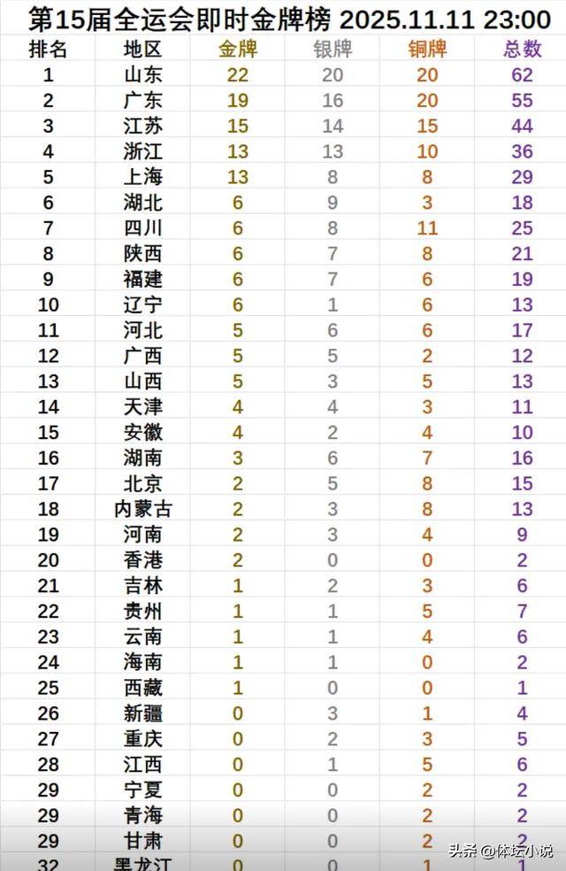 北京时间11月12日,全运会第二个比赛日在昨晚结束,当天产生32枚金牌被瓜分完毕,很多代表队拿到了金牌,山东和广东齐齐轰下5金,最新的金牌榜已经发生了天大的变化,前五名变化不大,山东仍比广东多出三金,位居第一,江苏力压浙江上海排名第三,湖北冲到第六,五队同是6金,三队同是5金!
