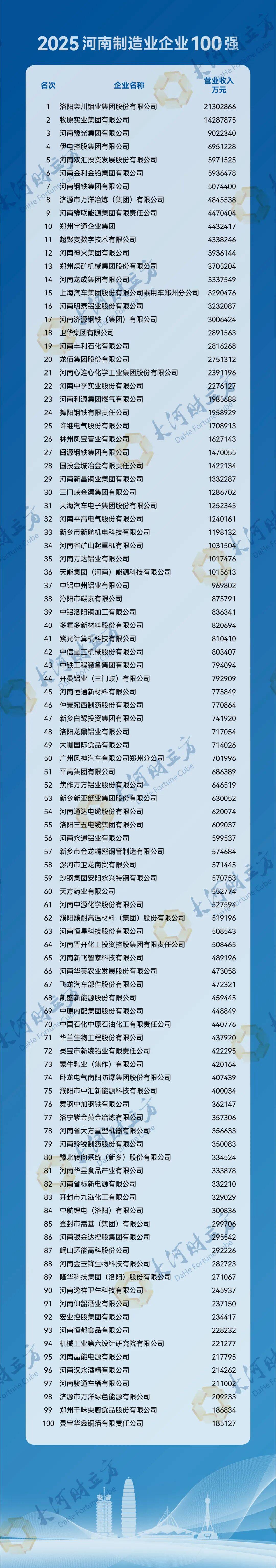 会上发布了《2025河南企业100强发展报告》以及百强名单。洛阳栾川钼业集团股份有限公司、中国平煤神马控股集团有限公司、牧原实业集团有限公司、中国建筑第七工程局有限公司、河南能源集团有限公司、河南交通投资集团有限公司、河南豫光集团有限公司、伊电控股集团有限公司、中铁七局集团有限公司、河南双汇投资发展股份有限公司位列名单前十。