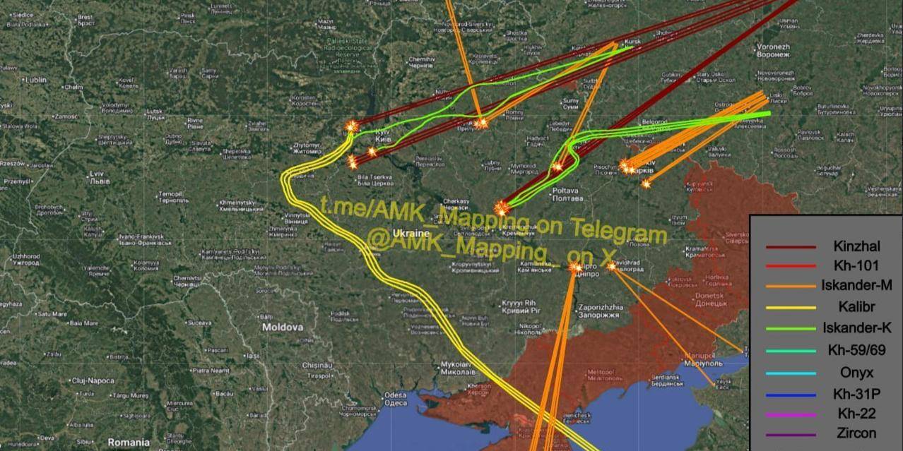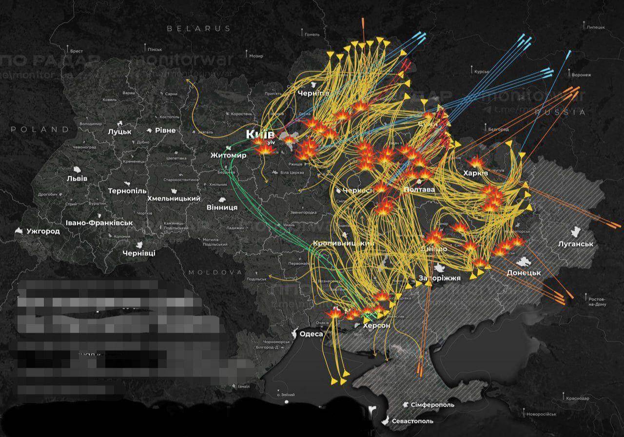 俄军对波尔塔瓦州的天然气储藏设备轰炸最狠,遭到俄罗斯空天军米格-31K战斗机发射的5枚"匕首"高超音速导弹和俄罗斯陆军发射的9枚"伊斯坎德尔-K"巡航导弹轰炸。乌克兰基辅州地区遭到了6枚俄罗斯空天军米格-31K战斗机发射的5枚"匕首"高超音速导弹、俄罗斯海军黑海舰队护卫舰发射的3枚"口径"巡航导弹、俄罗斯陆军发射的2枚伊斯坎德尔-K巡航导弹的袭击。同时,乌克兰全境40多个大中小城市,统统遭到轰炸,除了俄军,大部分轰炸由俄罗斯军队发射的伊朗“小摩托”,沙赫德-136自杀式无人机。