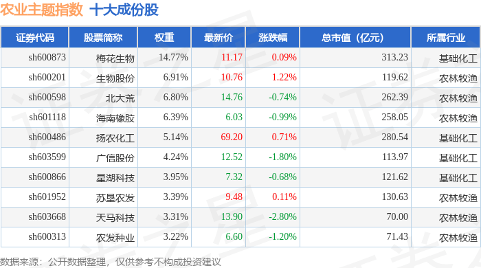 证券之星消息,11月12日,农业主题(000122)指数报收于1647.15点,跌0.28%,成交45.39亿元,换手率1.59%。当日该指数成份股中,上涨的有10家,蔚蓝生物以1.39%的涨幅领涨,下跌的有21家,天马科技以2.8%的跌幅领跌。