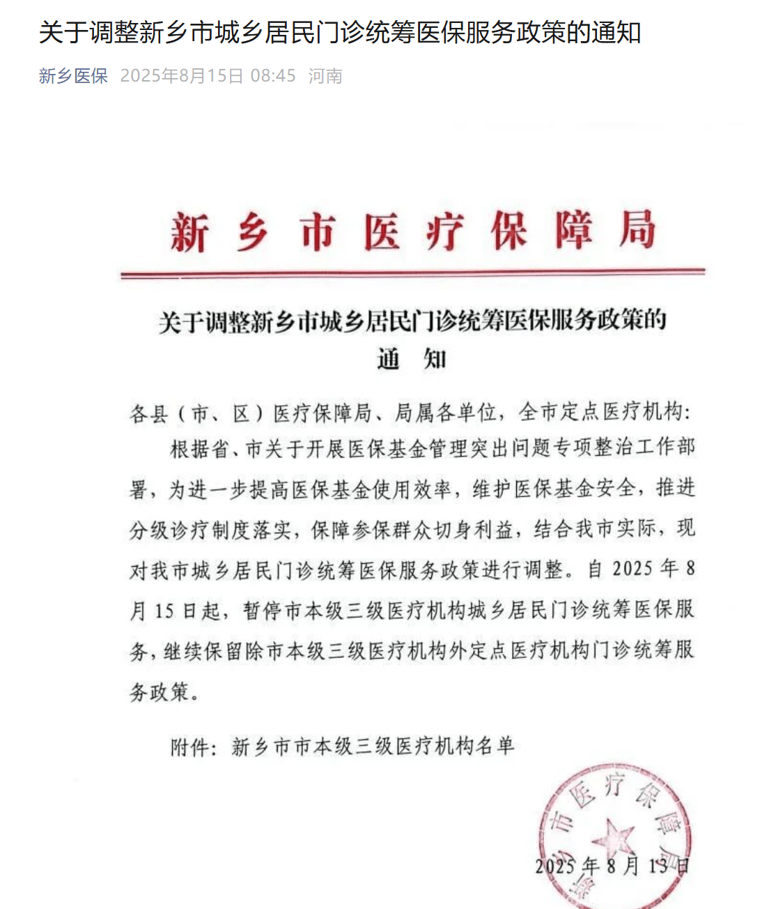 另在今年8月,新乡市决定暂停该市三级医疗机构城乡居民门诊统筹医保服务。