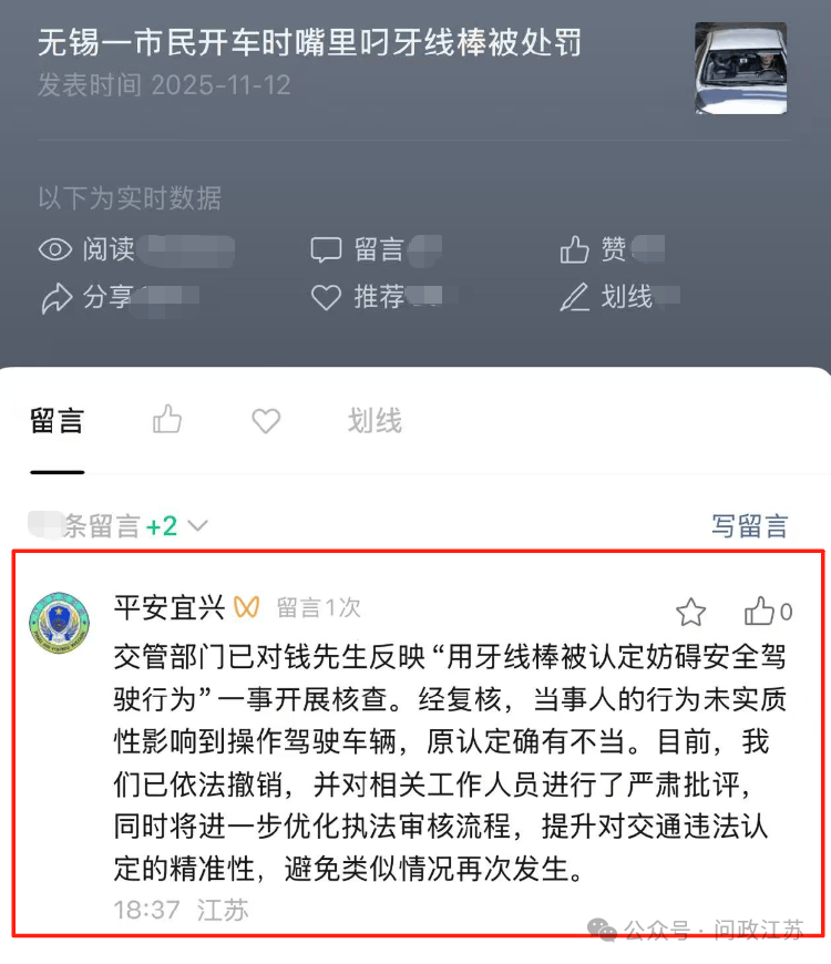 原标题:追踪|开车时嘴里叼牙线棒被处罚 宜兴交管部门:原认定确有不当,已依法撤销