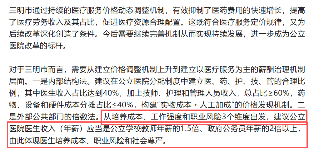 文章明确提到,从培养成本、工作强度和职业风险3个维度出发,建议公立医院医生收入(年薪)应当是公立学校教师年薪的1.5倍、政府公务员年薪的2倍以上,由此体现医生培养成本、职业风险和社会尊严。