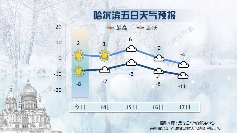14日白天最高气温:大兴安岭北部-9~-7℃,大兴安岭南部、黑河、伊春、齐齐哈尔北部、绥化北部-4~-2℃,鹤岗、佳木斯东部、齐齐哈尔南部-2~0℃,牡丹江3~5℃,其它地区0~2℃。