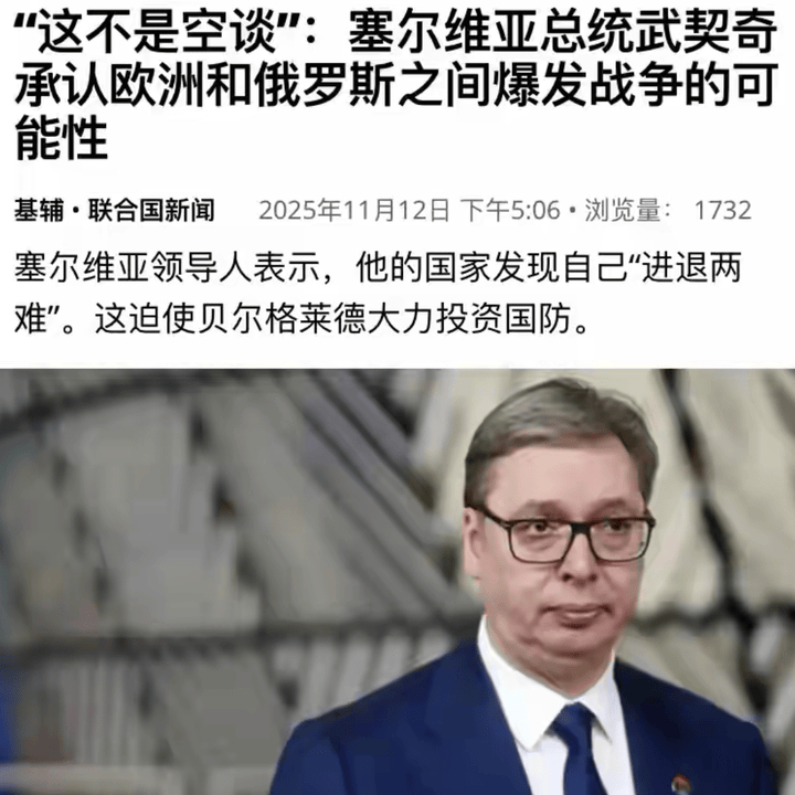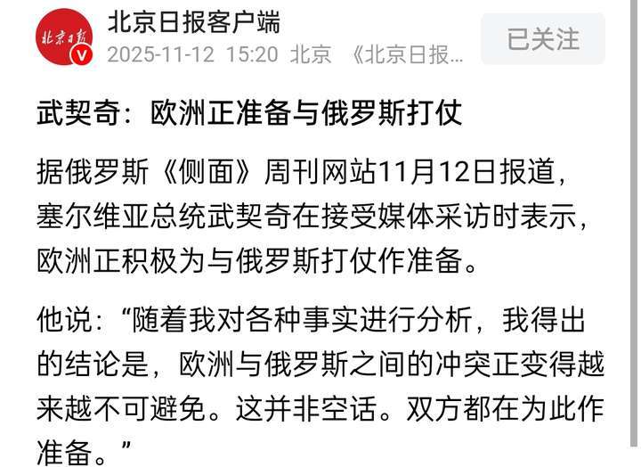 消息来源:《北京日报客户端》11月12日报道《武契奇:欧洲正准备与俄罗斯打仗》
