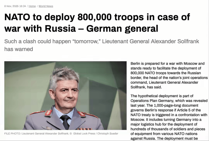 更值得警惕的是,欧洲国家的军事准备已超越“支援乌克兰”的范畴,转向“直接应对俄罗斯”。德国联邦国防军联合行动司令部司令亚历山大·索尔弗兰克中将公开宣称“柏林已为与莫斯科的战争做好准备”,并披露早在2024年就起草完成的“德国行动计划”——这份1000页的作战蓝图,明确要求在冲突爆发后180天内,将德国打造为北约向俄边境投送军力的“核心后勤枢纽”,最终实现80万北约大军在俄边境的部署。
