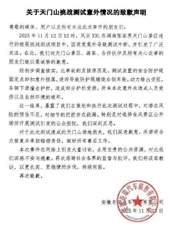 11月13日,安徽奇瑞汽车销售有限公司官方发布关于天门山挑战测试意外情况的致歉声明: