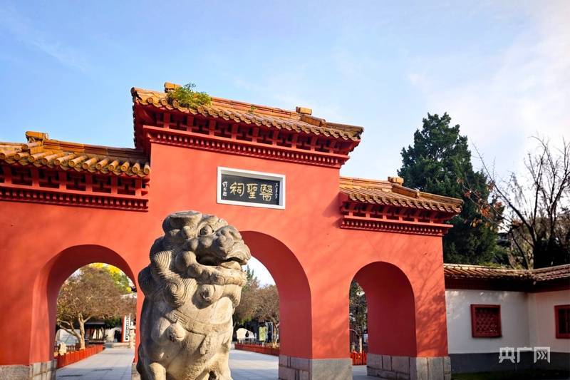 初冬的暖阳洒在医圣祠匾额下的石狮上(央广网记者 张羲轮 摄)