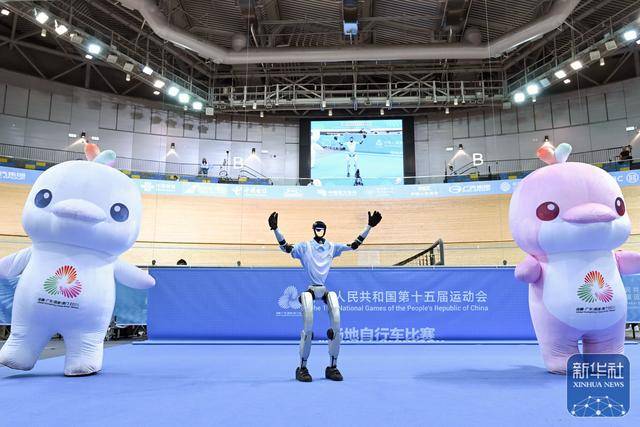 ↑ 第十五届全国运动会吉祥物和机器人在赛前表演。 新华社记者 胡虎虎 摄