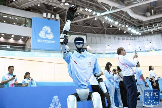 ↑ 一名赛事技术官员赛前同参与表演的机器人击掌合影。 新华社记者 胡虎虎 摄