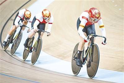 11月13日,第十五届全运会场地自行车比赛在香港单车馆拉开帷幕。首日比赛中,河南健儿打破男、女团体追逐赛两项全国纪录,勇夺男、女团体竞速赛两枚金牌,展现出超强实力。图为女子团体竞速赛中的河南健儿。