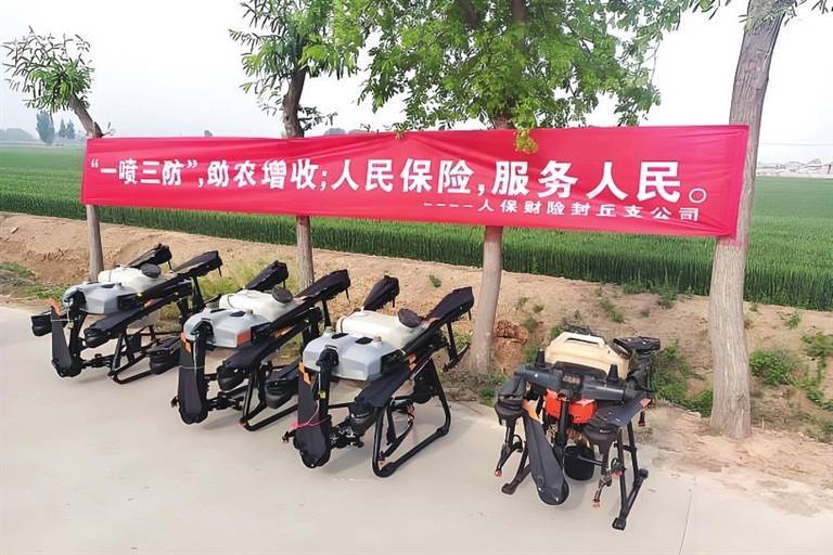 人保财险新乡市封丘支公司联合县农业农村局、鲁岗镇人民政府实施小麦“一喷三防”飞航作业。