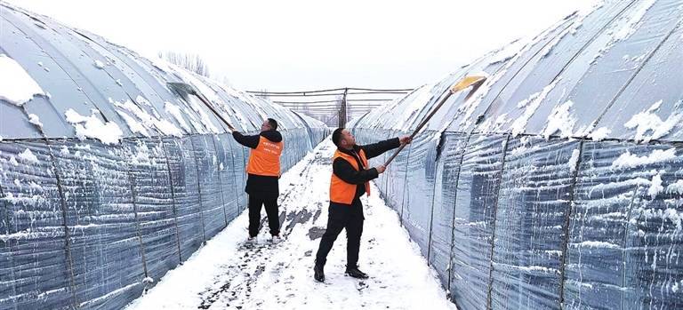 平安产险平顶山中支协助鲁山县食用菌种植农户清理棚顶积雪,开展风险减量工作。