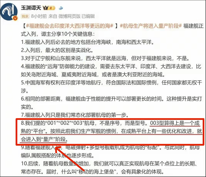 中央广播电视总台旗下的新媒体账号“玉渊谭天”近日发文,指出003型航母(以福建舰为代表)是成熟技术平台,将进入“量产阶段”。