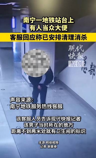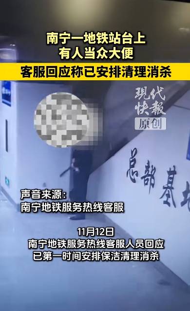 11月11日,广西南宁轨道交通3号线总部基地站,有人在站台公共区域当众大便。11月12日,南宁地铁服务热线客服人员回应记者称,已第一时间安排保洁人员,对现场进行了清理和消杀工作,男子当时所在的地方距离不到两米就有卫生间的标识。