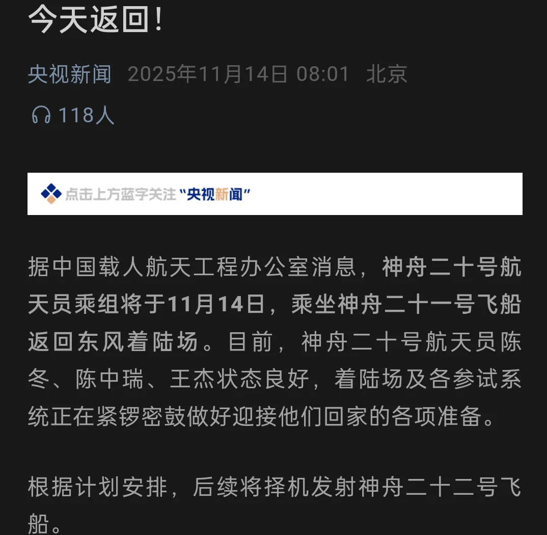 消息来源:《央视新闻》11月14日报道《神舟二十号飞船及航天员乘组将于今日返回》