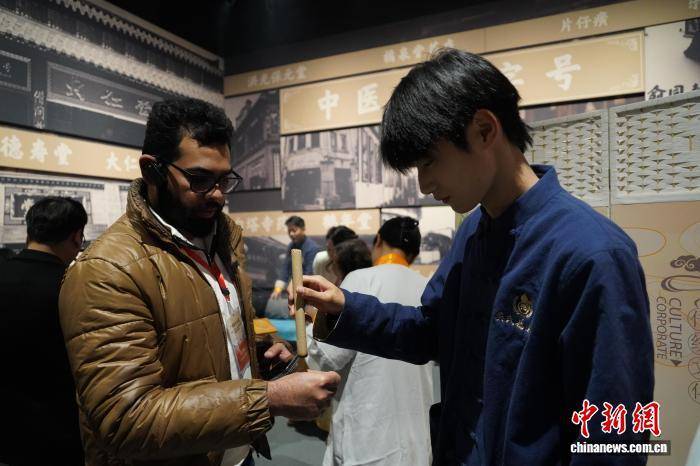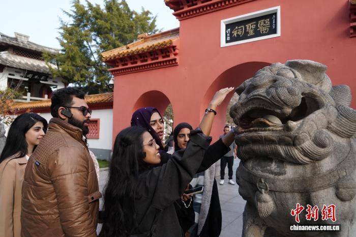 11月13日,2025“仲景奇遇记——外国青年、网络达人探访南阳中医药”网络国际传播活动在河南南阳启动。南阳市是东汉医学家、医圣张仲景的故里,医圣祠作为其张仲景的墓祠纪念地,被誉为中医祖庭,也是中医药文化的精神地标。当日,多国青年与网络达人探访医圣祠,体验传统中医技法,探寻养生智慧,感知仲景文化“根魂神韵”。图为外国青年触摸医圣祠门前石狮子。连晨宇 摄