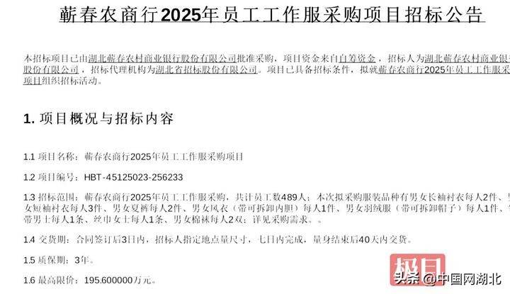在知情人士的指引下,极目新闻记者找到了今年10月,蕲春农商行2025年员工工作服采购项目招标公告。公告显示,该行计划自筹资金、最高限价195.6万元,为489名员工采购工作服,采购的服装品种有男女长袖衬衣每人2件,男女短袖衬衣每人3件,男女夏裤每人2件,男女风衣(带可拆卸内胆)每人1件,男女羽绒服(带可拆卸帽子)每人1件,男士每人1条领带,女士每人1条丝巾,男女棉袜每人2双。