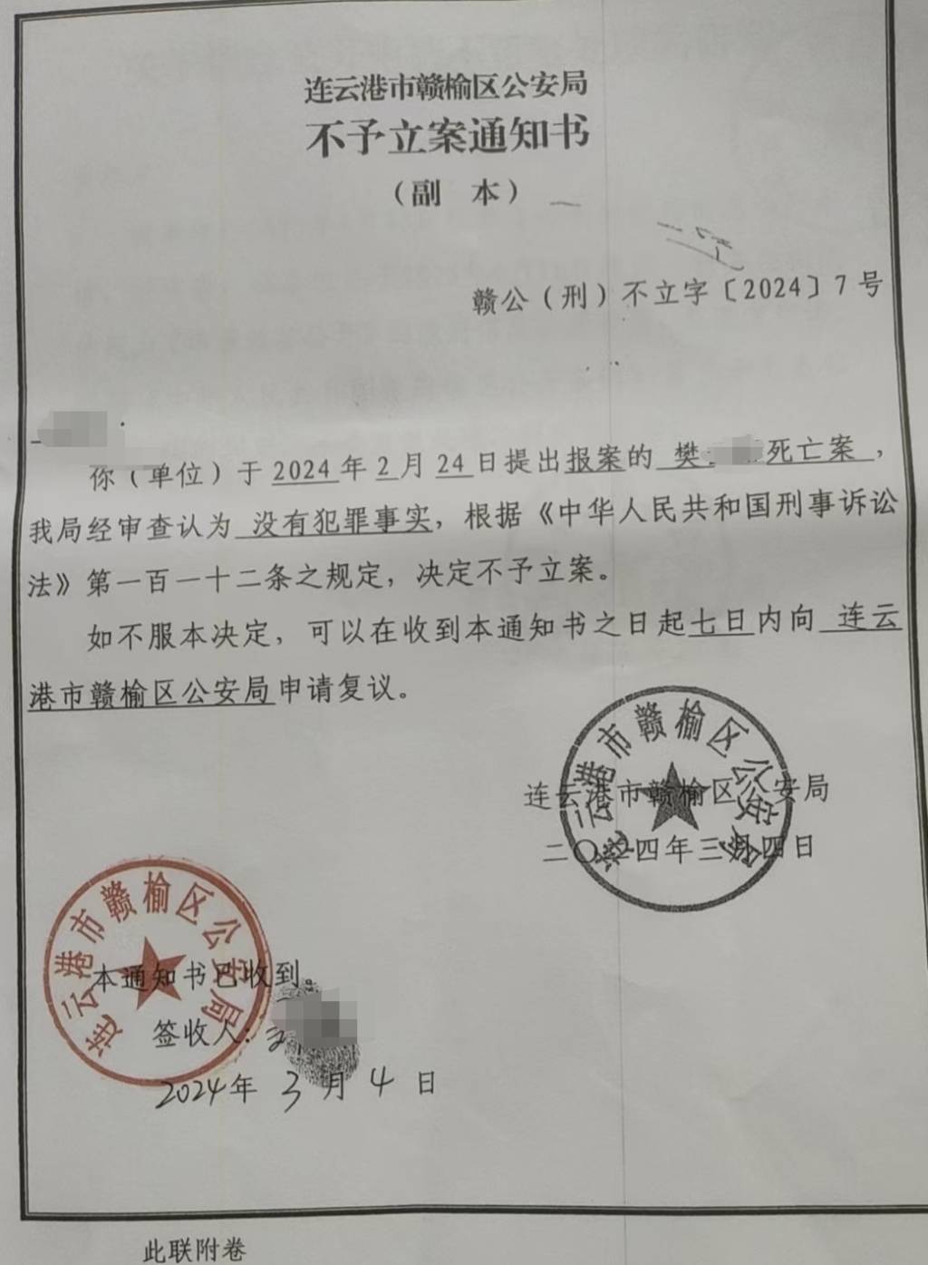 2025年8月,针对樊旭声要求查清其女儿“真实死因”等信访事项,赣榆区公安局塔山派出所向其作出书面回复:经调查,樊蕊死因排除他杀,你已与刘某达成协议并已履行完毕,相关情况民警已向你反馈。
