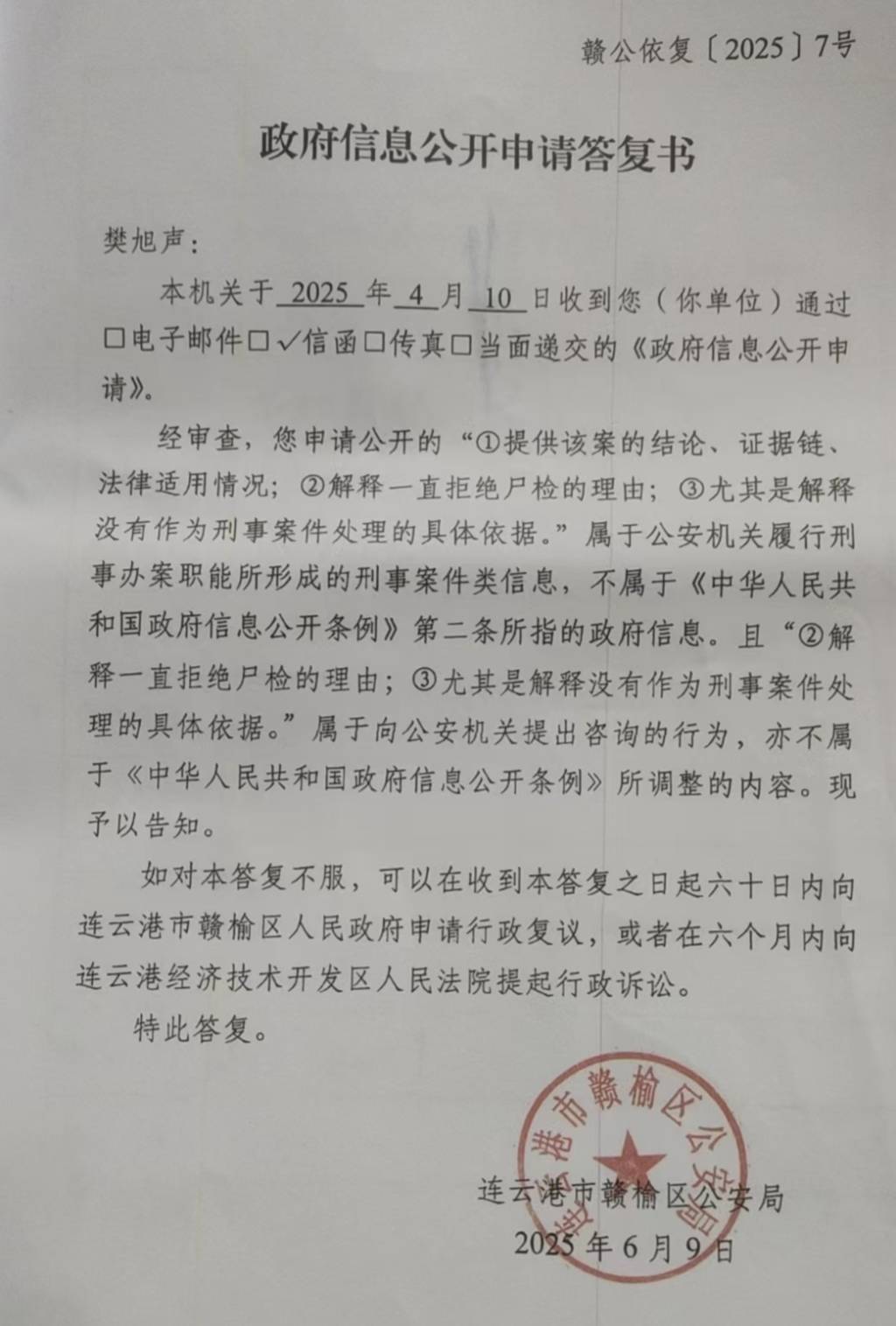 2025年4月,樊旭声向赣榆区公安局提交政府信息公开申请书,要求公开樊蕊之死的调查结论,以及未进行尸检、不予立案的依据。6月,警方答复樊旭声称,其申请内容属于刑事案件类信息,不属应公开的“政府信息”。此后,樊旭声向法院起诉赣榆区公安局。