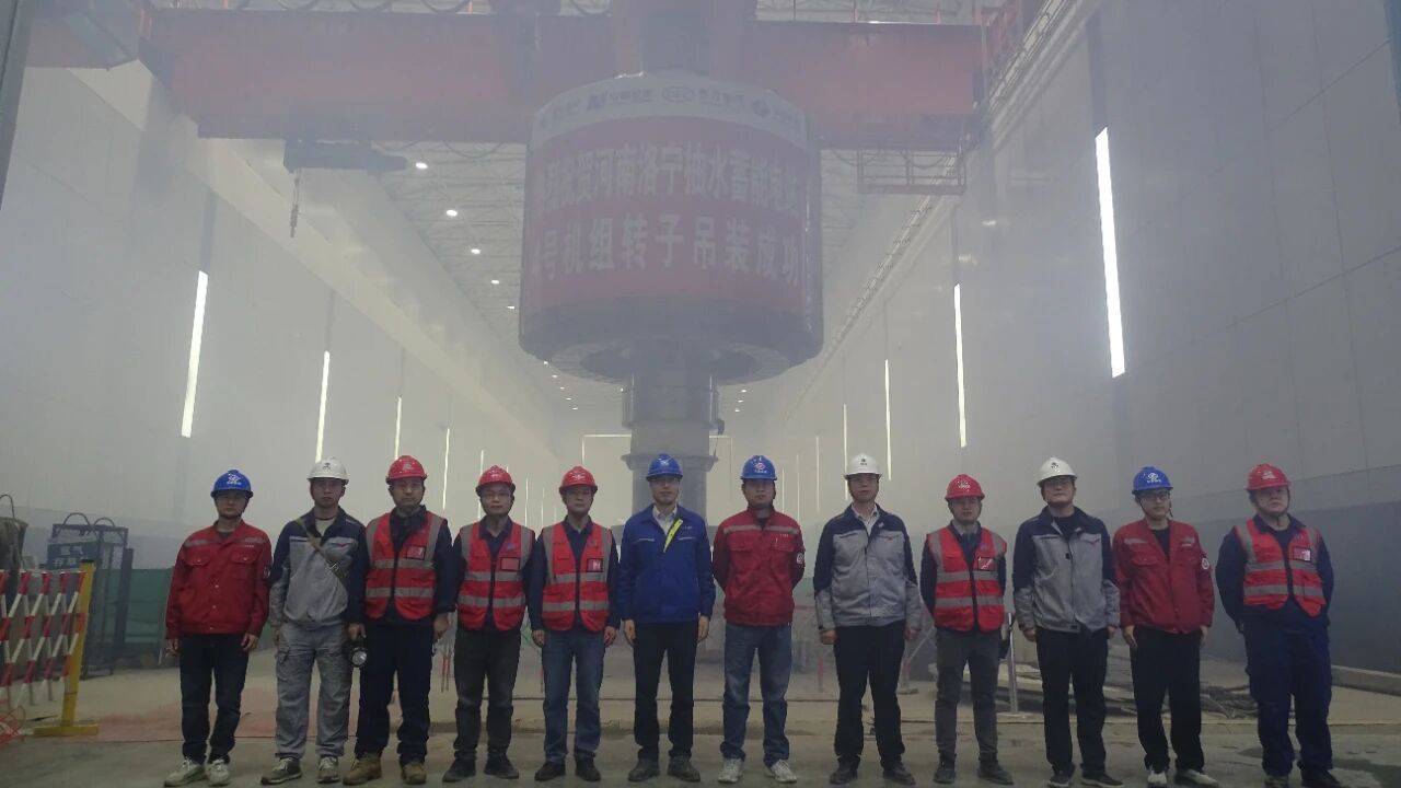 中国基建报讯(徐迎华、曾威华、张松峰 报道)11月8日上午9时,在河南洛宁抽水蓄能电站地下厂房内,随着现场总指挥一声令下,两台300吨桥机协同作业,将重达425吨的4号机组转子平稳吊起。经过90分钟精准操作,转子于10时30分准确落入机坑预定位置,标志着洛宁抽水蓄能电站最后一台机组核心部件安装完成阶段性目标,为2026年实现全面投产发电奠定坚实基础。
