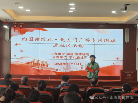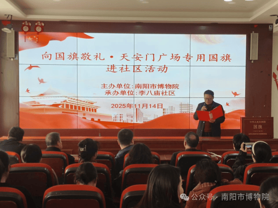 11月14日下午,南阳市博物院“向国旗敬礼·天安门广场专用国旗”进社区活动走进李八庙,南阳市博物院副院长李红、李八庙社区党支部书记高文俊、市博物院、市图书馆、市文化馆、李八庙社区居民等参加活动。此次活动旨在让天安门国旗的精神力量走进基层、浸润人心,让大家近距离感受国旗背后的家国情怀与时代担当。