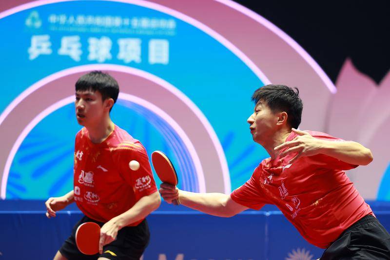 新华社照片,澳门,2025年11月14日,在澳门进行的第十五届全国运动会乒乓球男子团体小组赛A组比赛中,北京队3比0战胜河南队。 新华社记者 刘续 摄