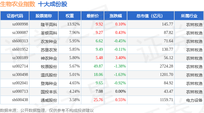 资金流向方面,生物农业(980072)指数成份股当日主力资金净流出合计11.34亿元,游资资金净流入合计2.54亿元,散户资金净流入合计8.8亿元。成份股资金流向详情见下表: