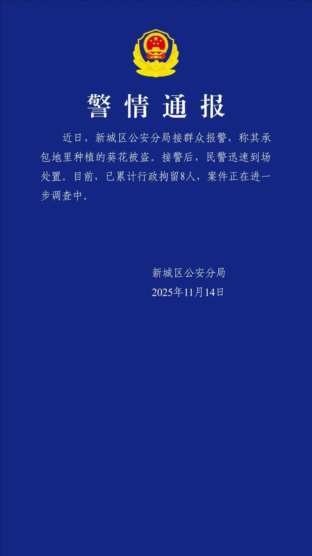 11月14日,呼和浩特市新城区公安分局发布警情通报:近日,新城区公安分局接群众报警,称其承包地里种植的葵花被盗。接警后,民警迅速到场处置。目前,已累计行政拘留8人,案件正在进一步调查中。