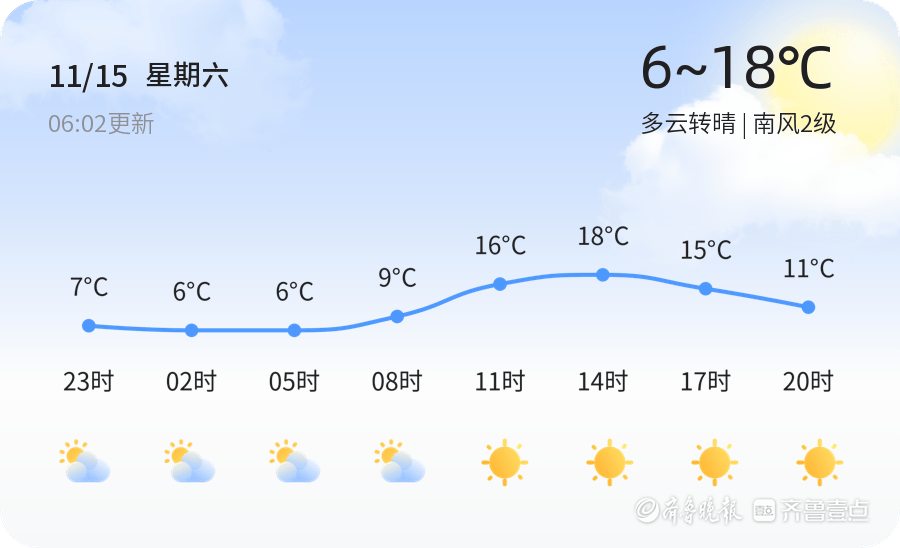 今天是2025年11月15日,星期六,农历九月廿六。东营市今日天气以多云转晴为主,气温介于6℃至18℃之间,南风2级,相对湿度为70%,空气质量指数为166。各区天气状况总体平稳,市民出行需注意适时添减衣物,防范感冒。
