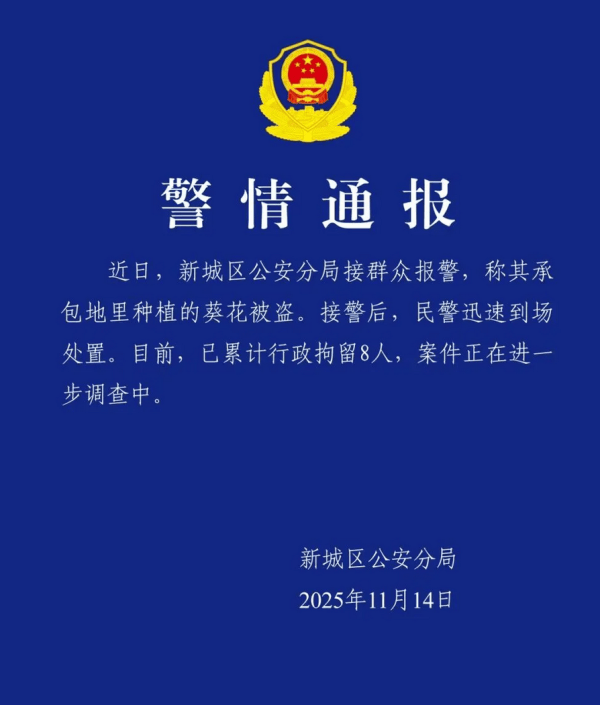 内蒙古呼和浩特新城区公安分局11月14日发布警情通报称,已累计行政拘留8人。