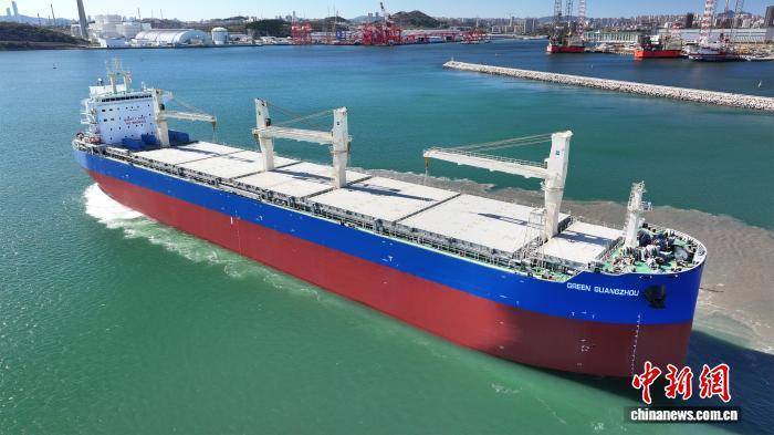 中新社大连11月14日电 (记者 杨毅)由大连中远海运重工有限公司建造的系列多用途纸浆船中的最后一艘——“GREEN GUANGZHOU”轮,14日在辽宁大连正式命名,即将交付船东,标志着大连中远海运重工自2017年承接的50艘多用途纸浆船建造订单全部完成。