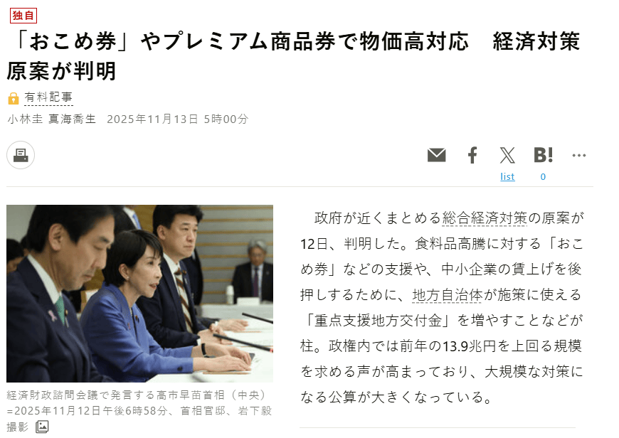 据朝日新闻11月12日报道,日本政府拟在月底出台的经济刺激措施中考虑纳入米券发放,以应对食品价格上涨。