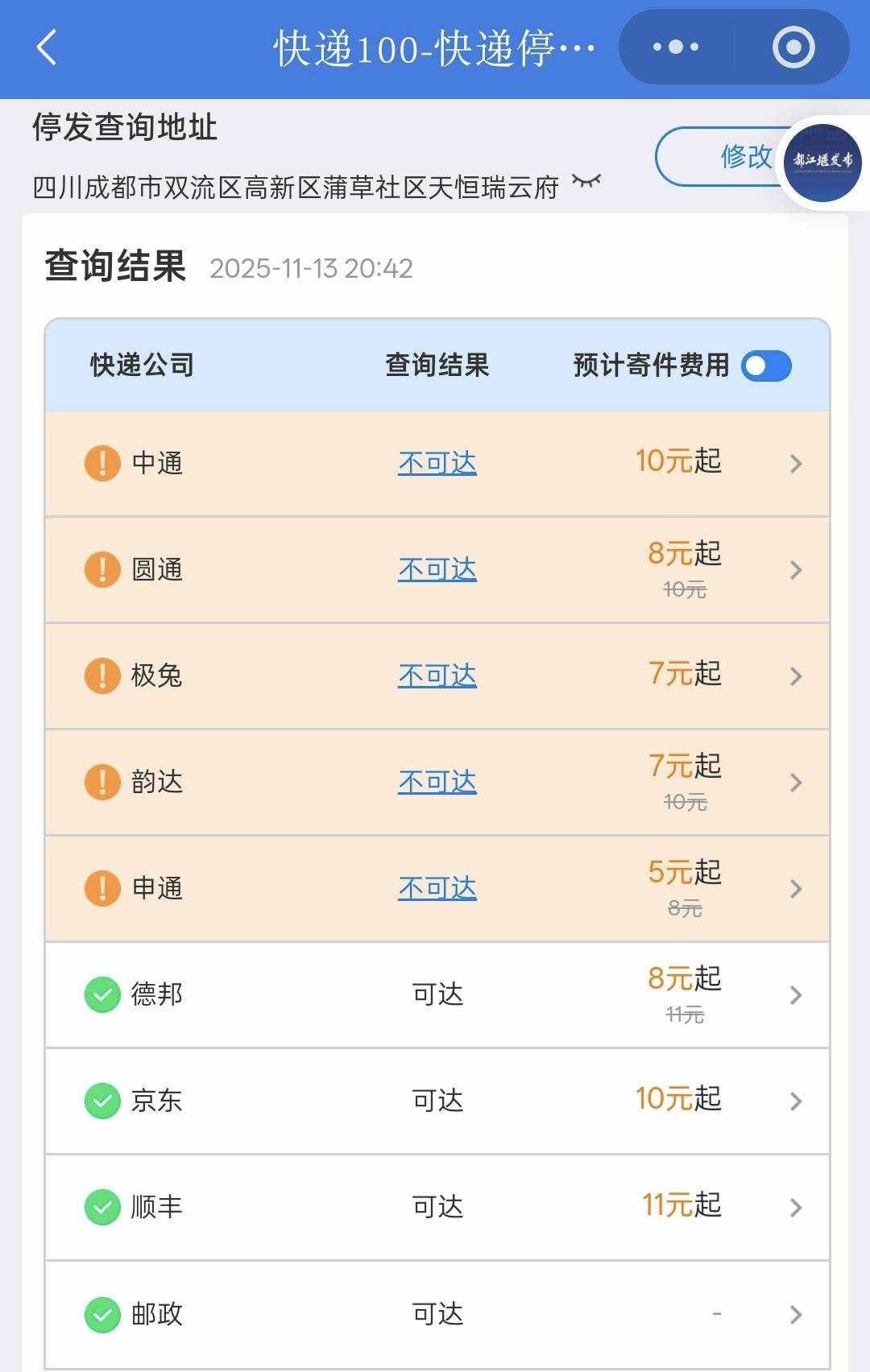 ▲“快递100“显示多家快递已不可达
