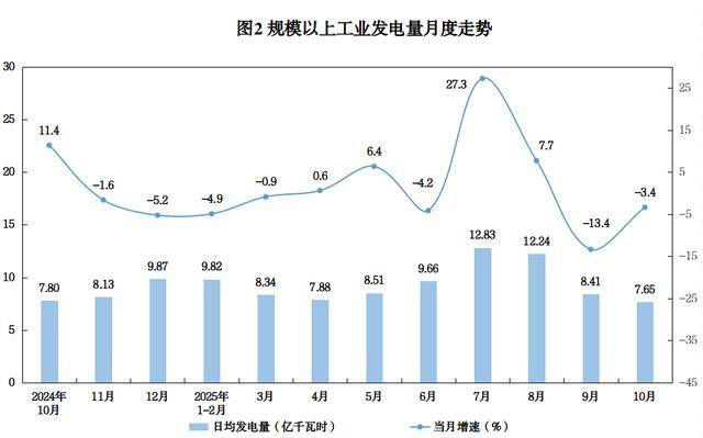 电力生产小幅下降,与上月相比降幅收窄。10月份,规模以上工业发电量237.12亿千瓦时,同比下降3.4%,降幅比9月份收窄10.0个百分点,日均发电7.65亿千瓦时。