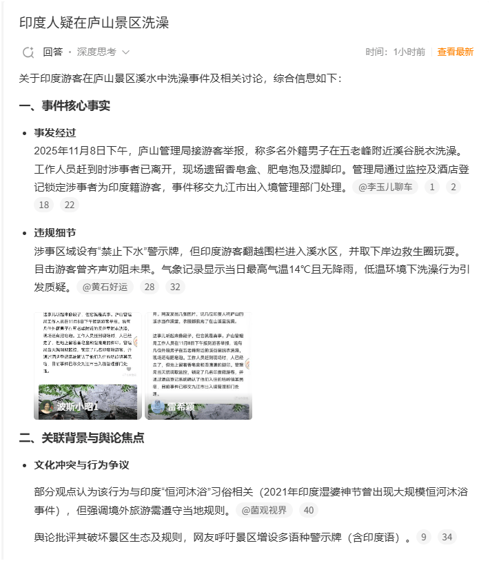 智搜总结说,2025年11月8日下午庐山管理局接游客举报,称多名外籍男子在五老峰附近溪谷脱衣洗澡。工作人员赶到时涉事者已离开,现场遗留香皂盒、肥皂泡及湿脚印。管理局通过监控及酒店登记锁定涉事者为印度籍游客,事件移交九江市出入境管理部门处理。而涉事区域设有明确的“禁止下水”警示牌,但印度游客翻越围栏进入溪水区,并取下岸边救生圈玩耍,目击游客曾齐声劝阻,但印度人不听。而且当时当地气温才14度又无降雨。