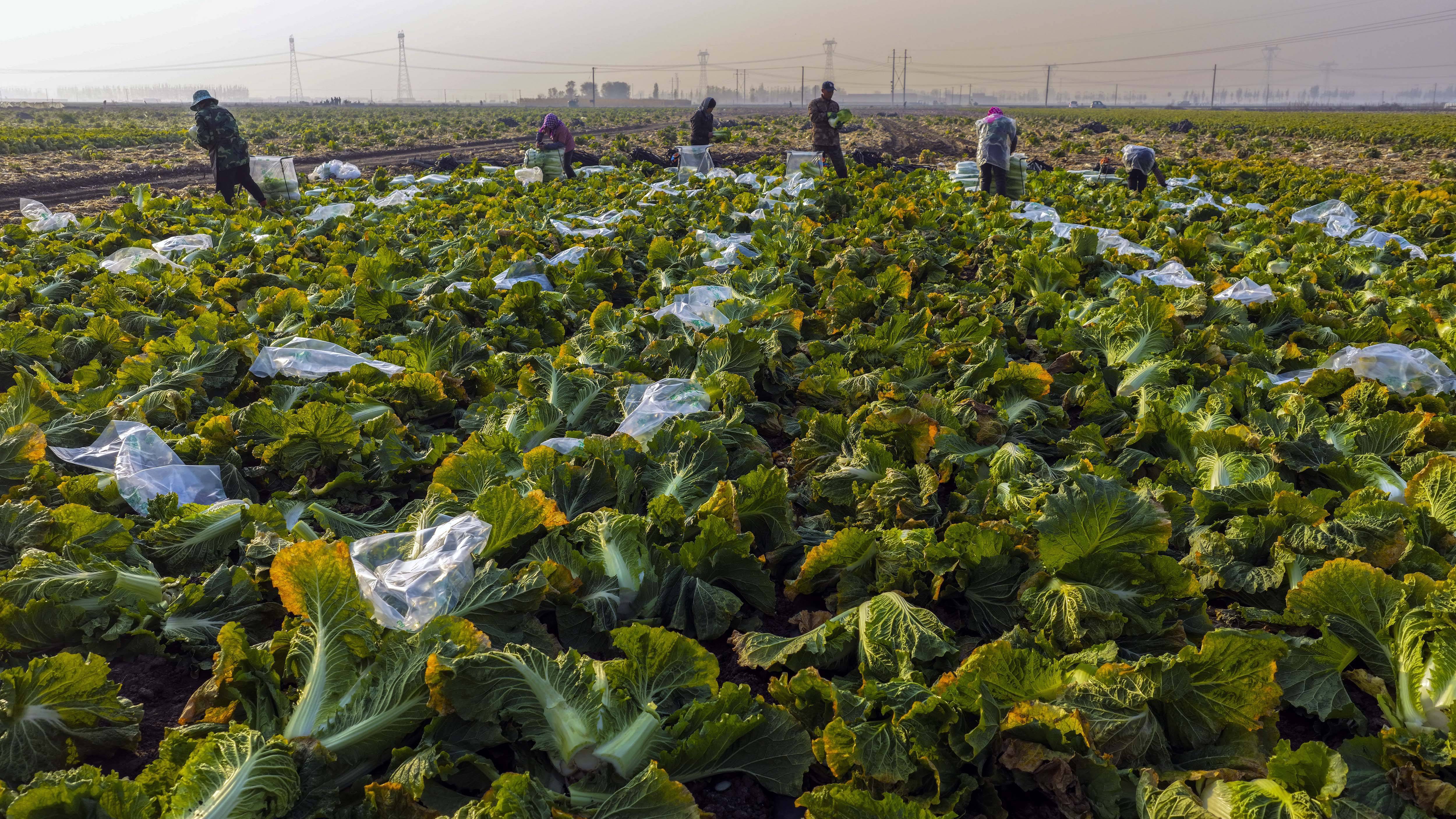 为应对寒潮天气,河北省唐山市玉田县农民加紧田间大白菜的抢收、外运和防寒工作,保障冬季蔬菜供应。