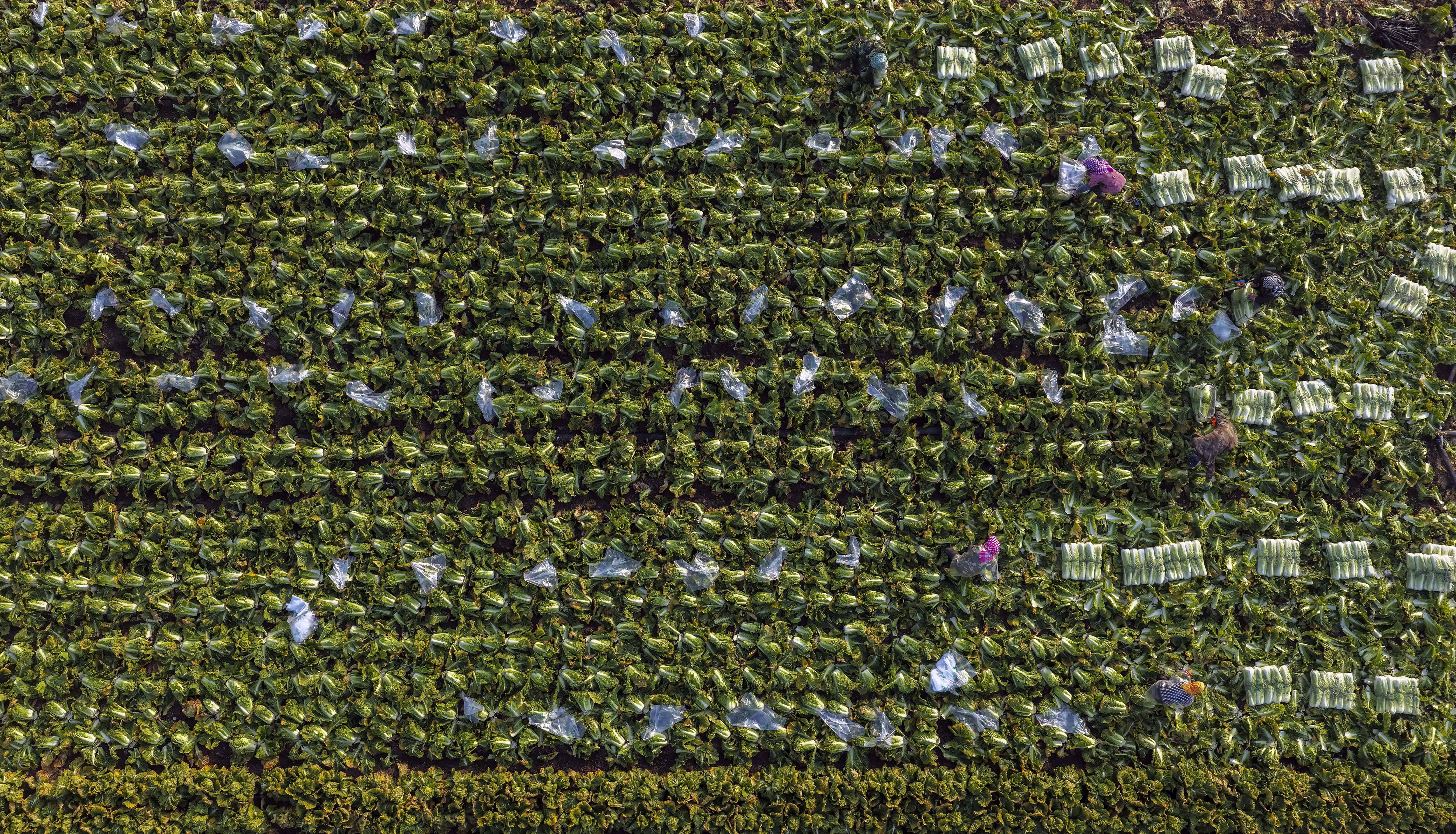 11月15日,河北省唐山市玉田县虹桥镇农民在田间抢收大白菜(无人机照片)。 新华社发(刘满仓摄)