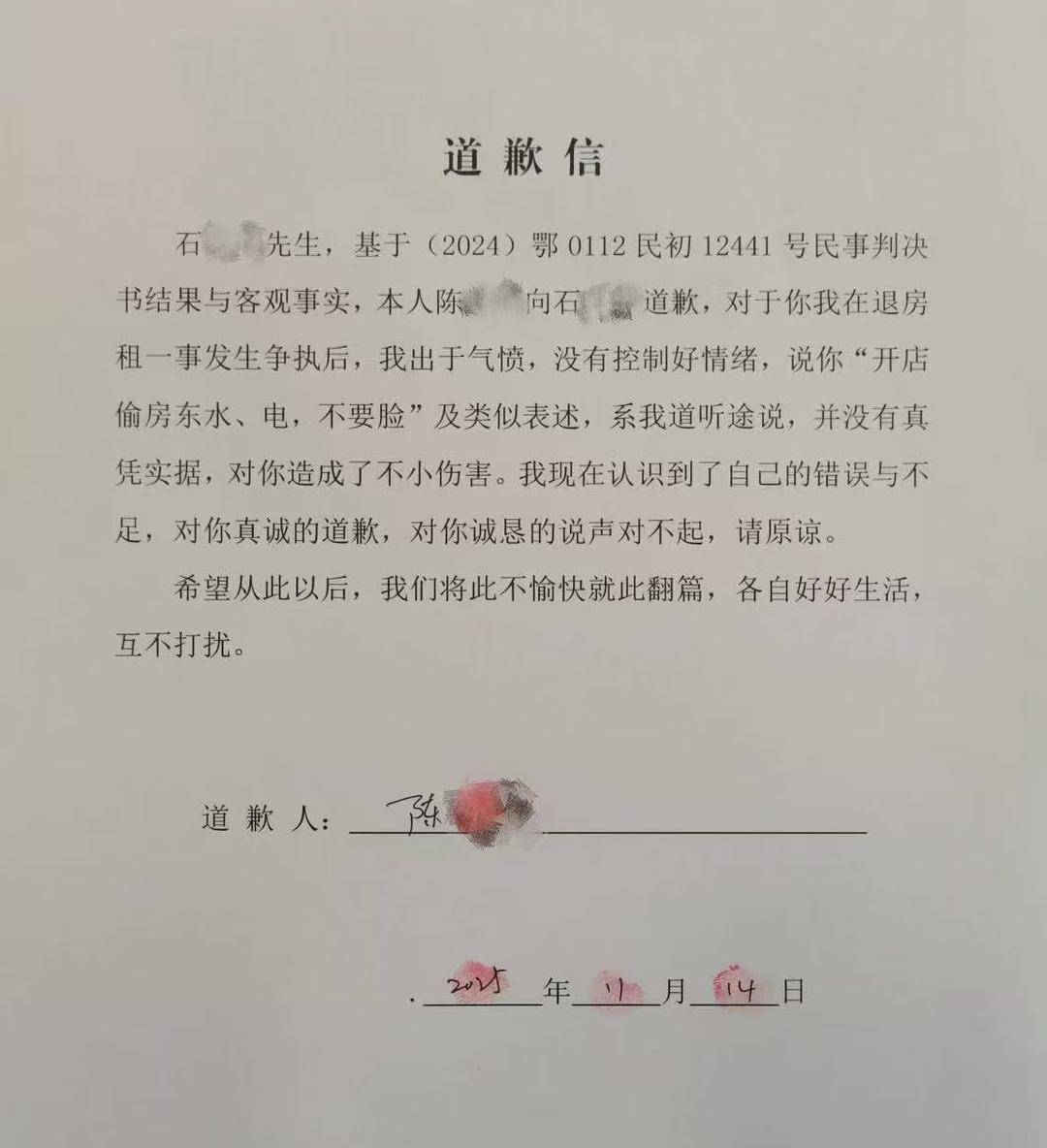 11月14日,石先生告诉红星新闻记者,在法院和公安机关的协调下,房东已向他书面道歉,他也接受了道歉。
