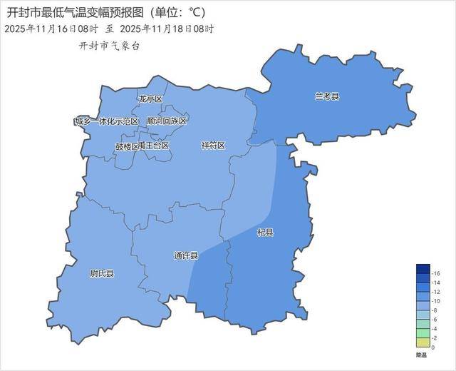 2025年11月16日08时-18日08时开封市最低气温变幅预报图