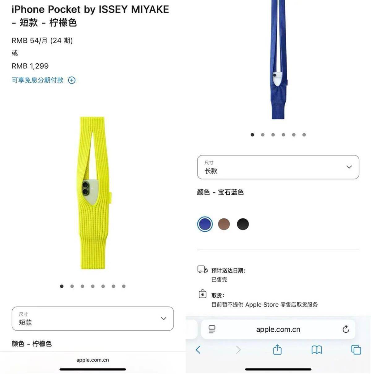 此次推出的iPhone Pocket分为短款和长款两个版本,短款售价1299元,提供柠檬色、柑橘色、紫色等八种色彩;长款售价1899元,拥有宝石蓝色、肉桂色、黑色三种选择。开售不久后,肉桂色长款便率先售罄,潮玩平台得物上,长款市场价已涨至2399元,短款涨至1699元,溢价幅度最高达500元。