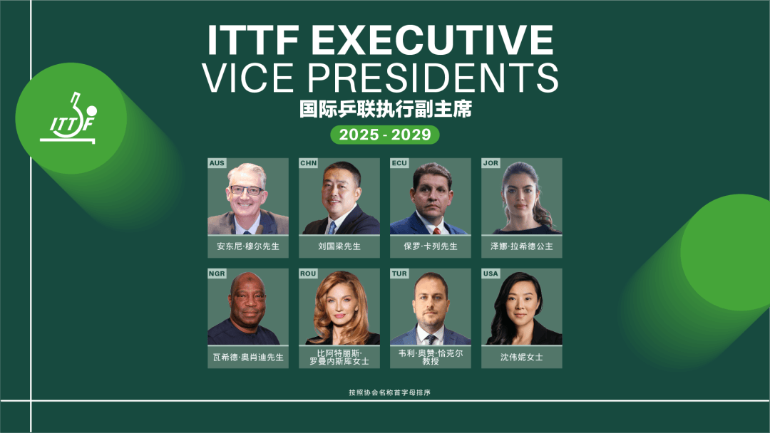 国际乒联选出包括刘国梁在内的8位执行副主席(任期为2025年至2029年),连同今年5月连任的主席佩特拉·索林,将共同履职。其中,刘国梁以160票(占投票人数比90.91%)在执行副主席中排名第一。