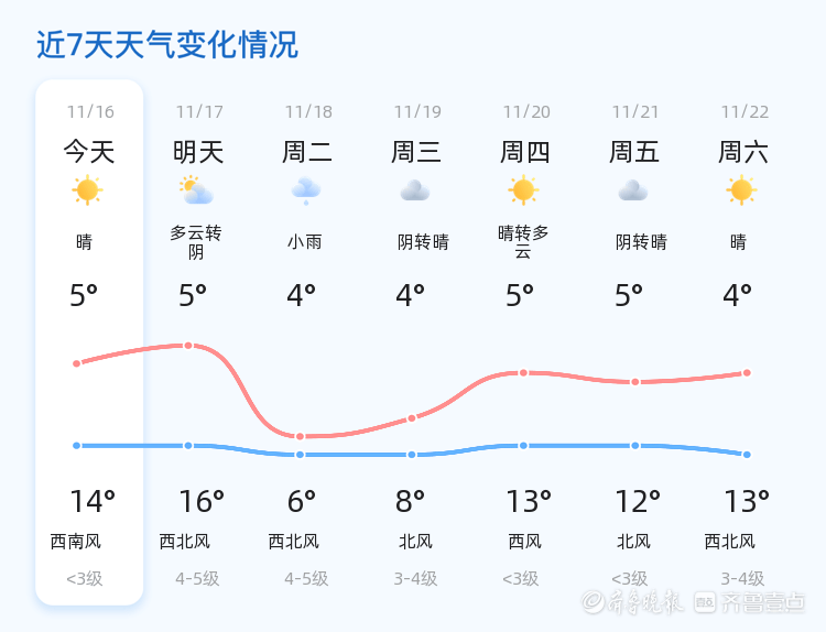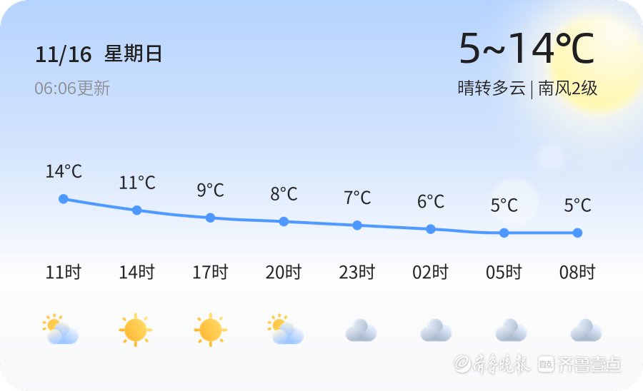 今天是11月16日,农历九月廿七,威海市迎来了一天的晴转多云天气。全市各区气温在5℃到14℃之间,空气湿度为80%,PM2.5指数为56,空气质量良好。当前时间为6时06分,温度为14.6℃,南风2级,总体天气条件适宜出行。