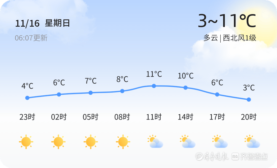 今天是11月16日,星期日,农历九月廿七。滨州今日天气多云,气温介于3℃至11℃之间,当前温度6℃,西北风1级,空气湿度96%。空气质量状况为中度污染(PM2.5指数176),建议敏感人群减少户外活动。市民出行时请注意保暖,随身携带雨具以备不时之需。