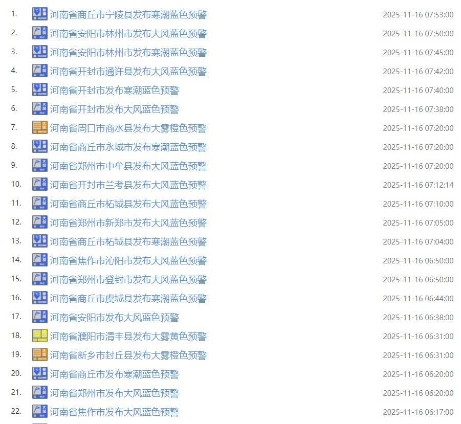 郑州市气象台2025年11月16日06时20分发布大风蓝色预警信号:预计今天白天10时至18时,郑州市主城区、航空港区所辖乡镇及街道有3到4级东北风,阵风7级左右。