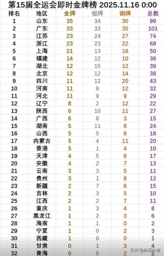 北京时间11月16日,全运会第六个比赛日在昨天结束,当天产生32金,被一扫而空,广东队单日大爆发,一口气狂轰7金成为大赢家,这样一来最新的金牌榜又发生了翻天覆地的变化,山东单日3金以35金排名第一,广东单日7金以33金排名第二,江苏单日2金反超浙江再次回到第三,香港5金第18,还是11队金牌突破两位数!
