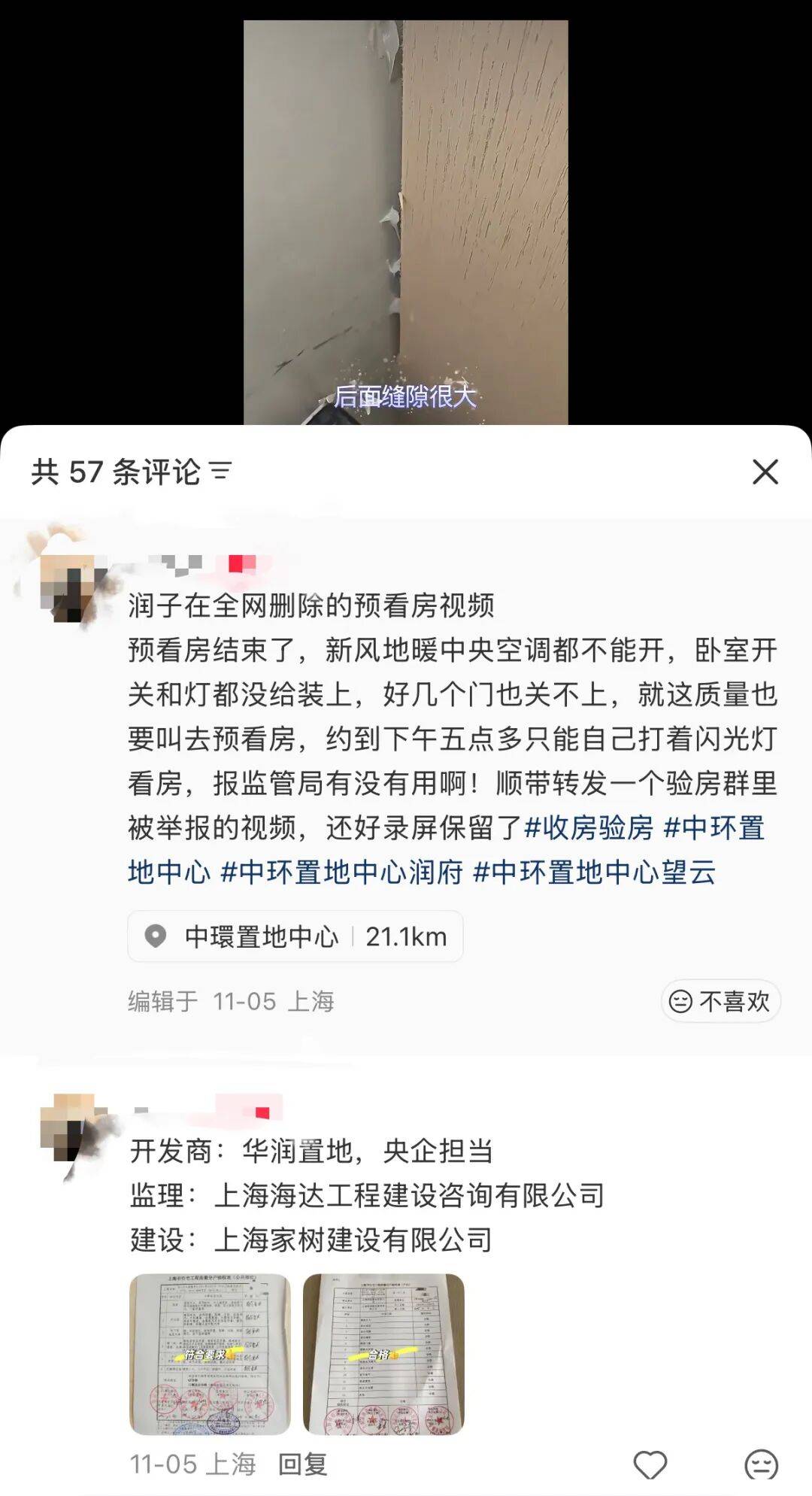 互联网平台上,有不少网友发帖吐槽项目存在的一系列问题,比如新风地暖中央空调都不能开、卧室开关和等都没装上、门关不上、卫生间窗户打开情况下会碰到花洒、玄关控制面板松动……