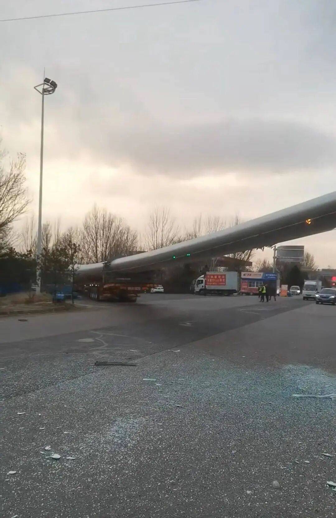 有网友发布的视频显示,道路上停着一辆损毁较为严重的大巴车,车身有“张运集团”相关标识。大巴车的车头受损较为严重,车身右侧车窗玻璃几乎全部缺失,车门处严重扭曲变形。现场还停放着一辆运输风力发电桨叶的大货车,桨叶停留的位置与前述大巴车车顶相隔很近。