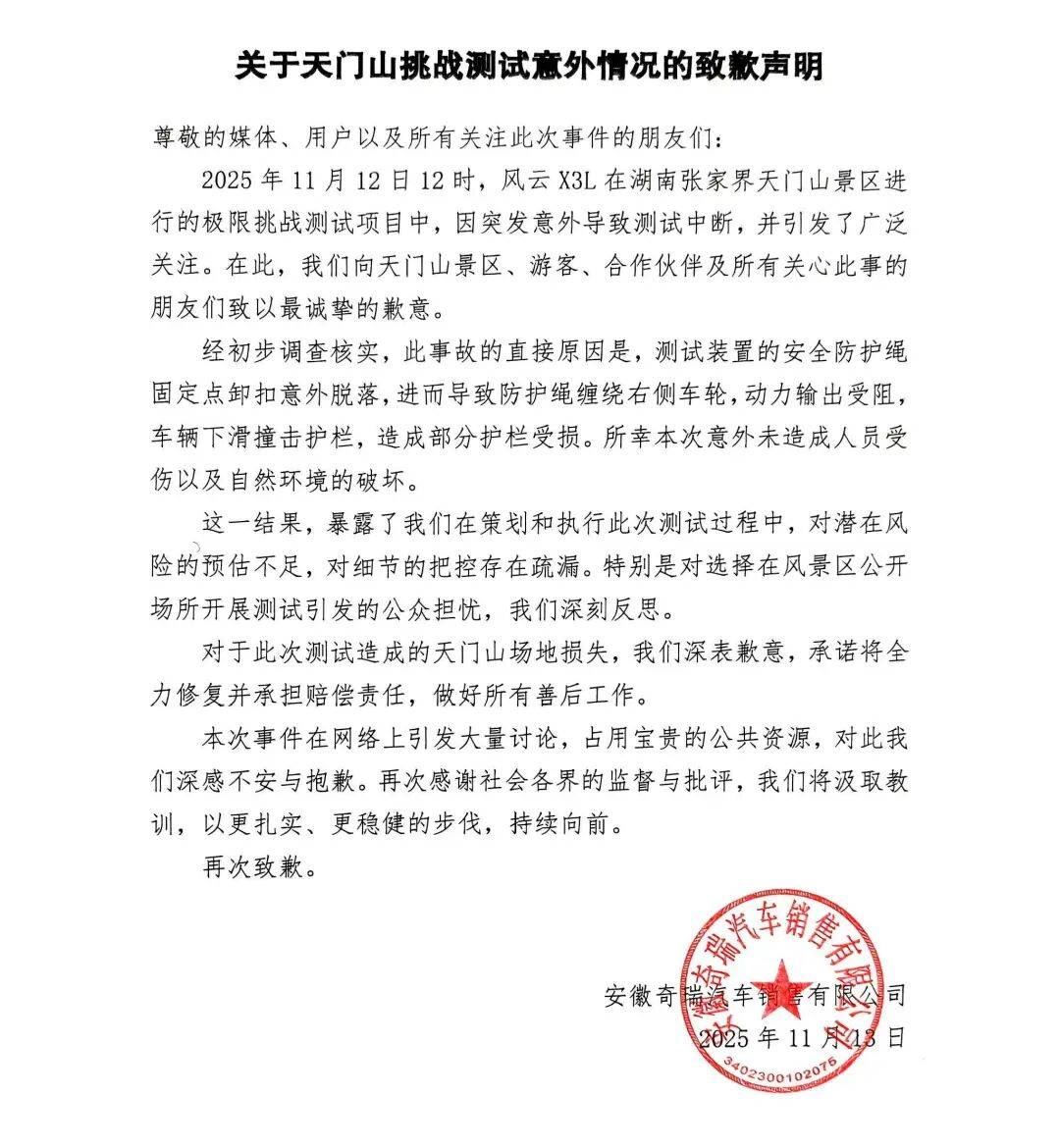 而在事故发生后,那份凌晨发布的致歉声明,更是让整件事变得耐人寻味。奇瑞将原因归结为「测试装置的安全防护绳固定点卸扣意外脱落」,试图将问题的焦点,从「车不行」引导向「工具不行」,从产品力不足转向执行疏忽。