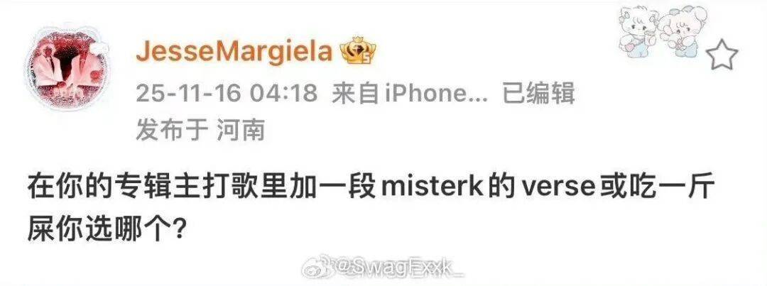 “在你的专辑主打歌里加一段misterk的verse或吃一斤屎你选哪个? ”